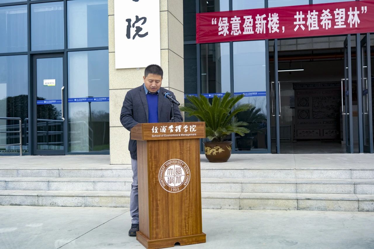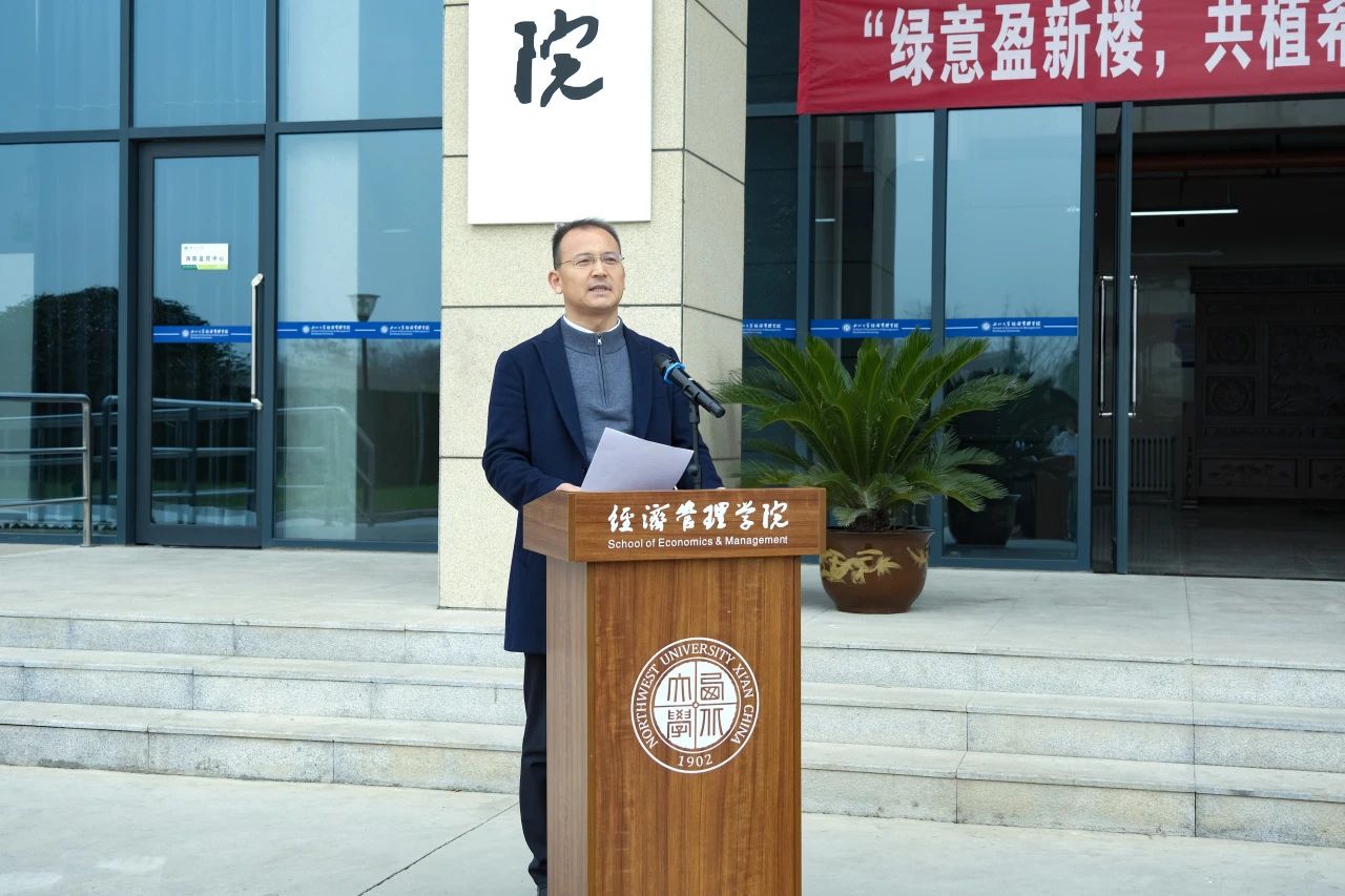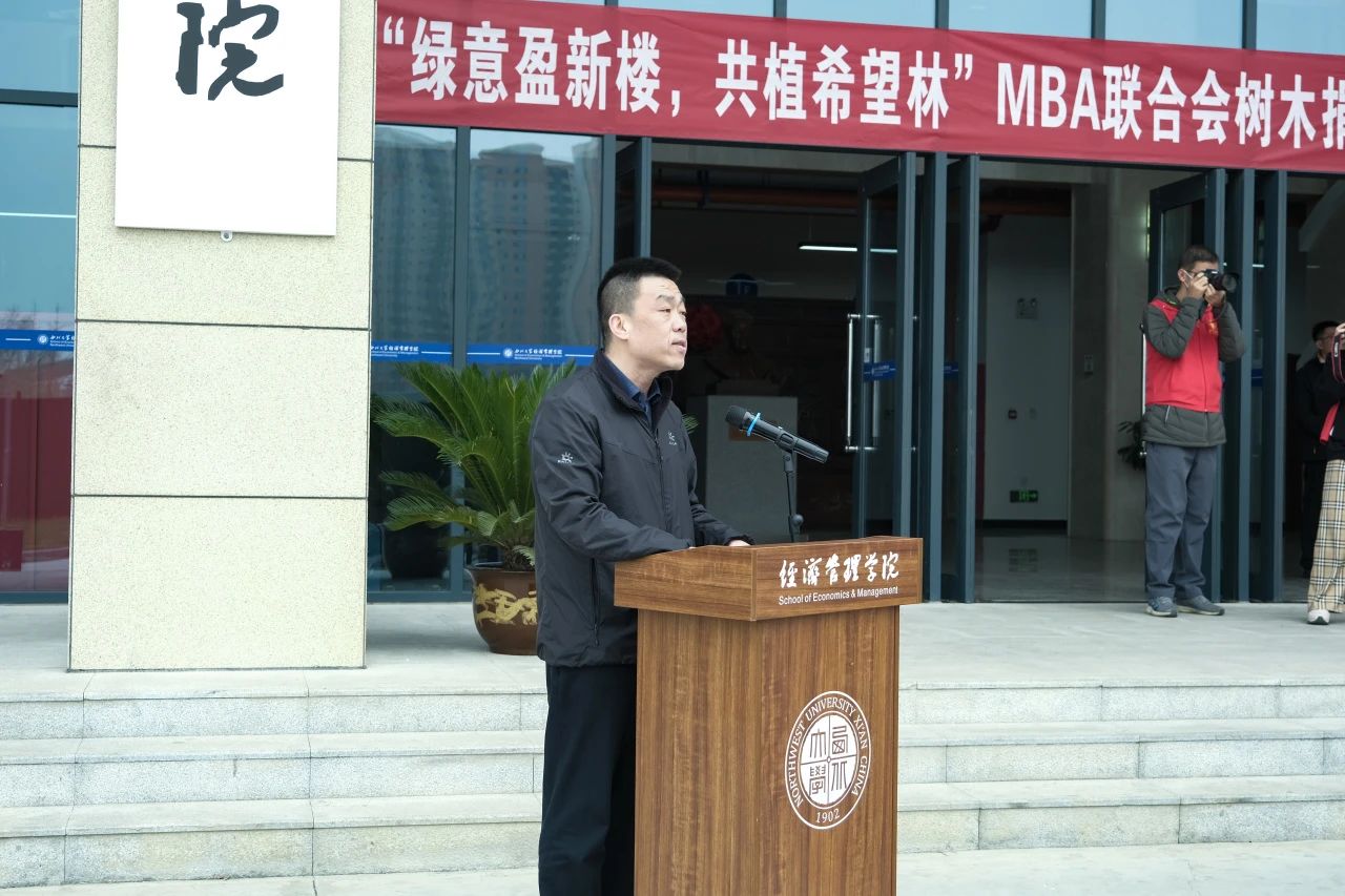 张志飞代表学校向参与此次活动的师生、校友及来宾表示热烈欢迎和诚挚感谢,对心系母校发展,支持母校建设的MBA杰出校友表达崇高敬意。他强调本次活动既是美化校园环境、提升校园品质的实际行动,也是进行劳动教育的具体内容,更是深入践行习近平总书记“绿水青山就是金山银山”发展理念的生动实践。他指出种下的桂花树和海棠树寓意着吉祥富贵、繁荣昌盛,期望西大学子在各自领域摘下胜利的桂冠,期望经管学院培育出更多具有全球视野与社会担当的栋梁之才,祝福西北大学在“双一流”建设中取得佳绩。
