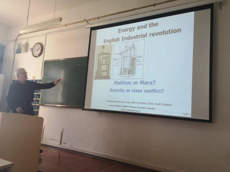2019年10月29日,挪威国家统计局高级经济师安德森·艾克兰应邀为776net必赢官网2017级经济学(基地班)及2017级数理经济学实验班学生作题为《能源和英国工业革命》的学术报告,报告在2308教室举行,由岳利萍教授主持。在报告中,艾克兰教授以能源的革新为切入点研究第一次英国工业革命,对马尔萨斯和马克思关于工业革命成因的争论展开论述,并从能源的稀缺性和社会阶级矛盾冲突两个角度进行了解释和分析。