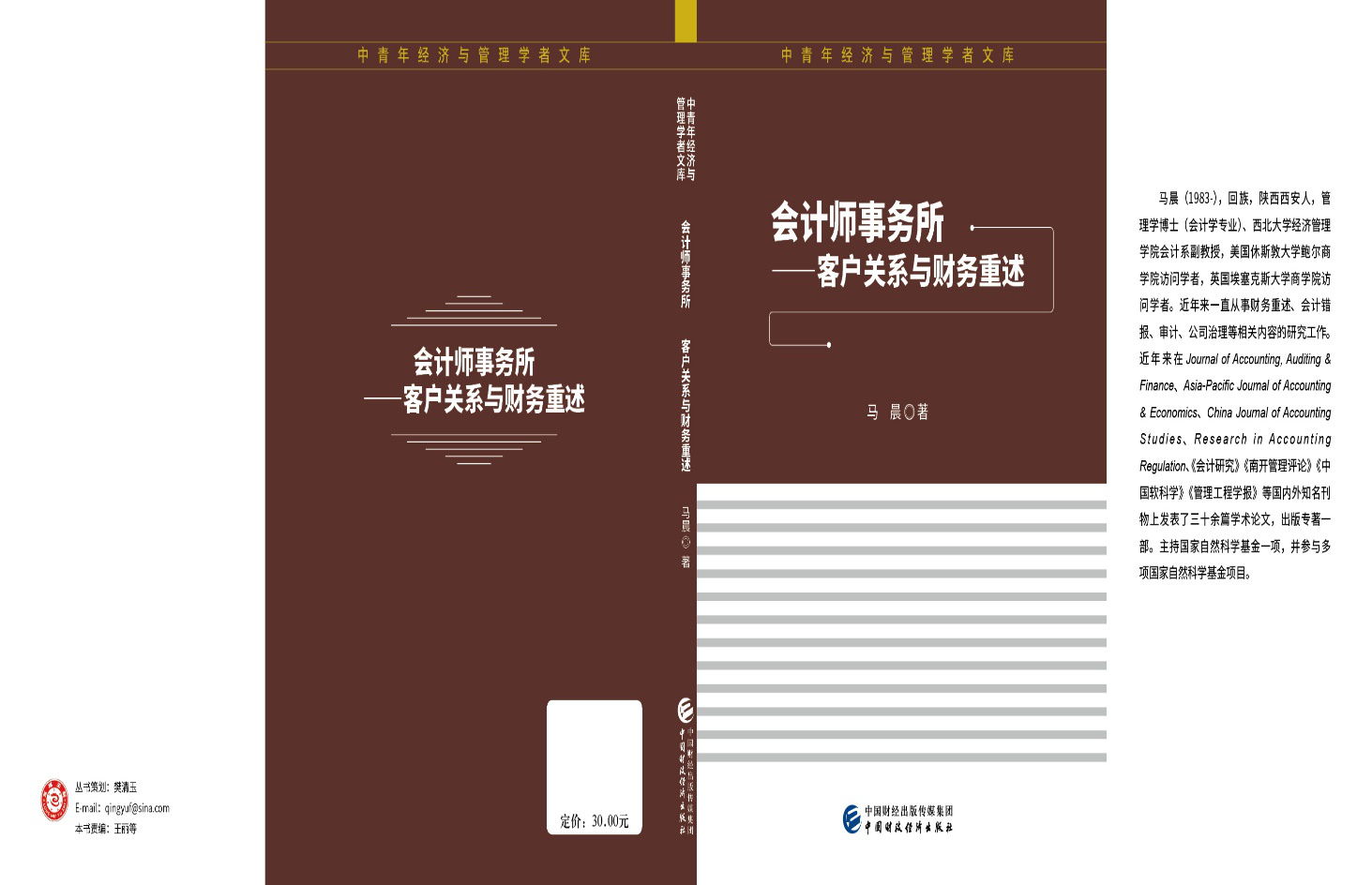 近日,由我院会计系教师马晨副教授独立撰写的专著《会计师事务所-客户关系与财务重述》出版,该书共7章内容,约12万字。