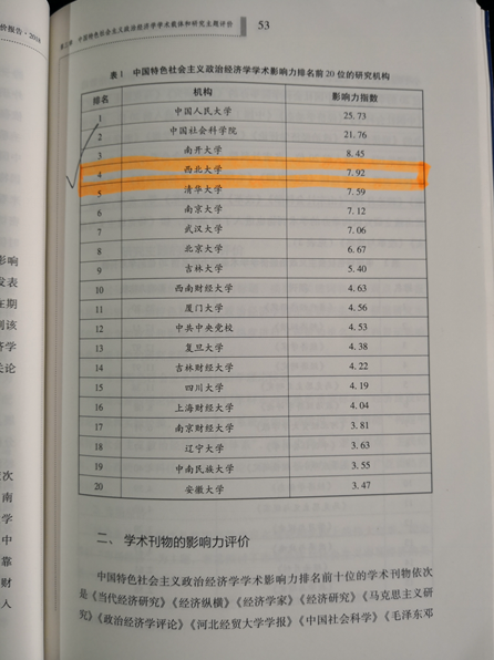 该报告以全国各研究机构在学术期刊发表的“中国特色社会主义政治经济学”论文的影响力为核心,测算了中国特色社会主义政治经济学研究机构排名。根据该书测算,西北大学的影响力指数为7.92,在全国排名第四,仅次于中国人民大学、中国社会科学院和南开大学。