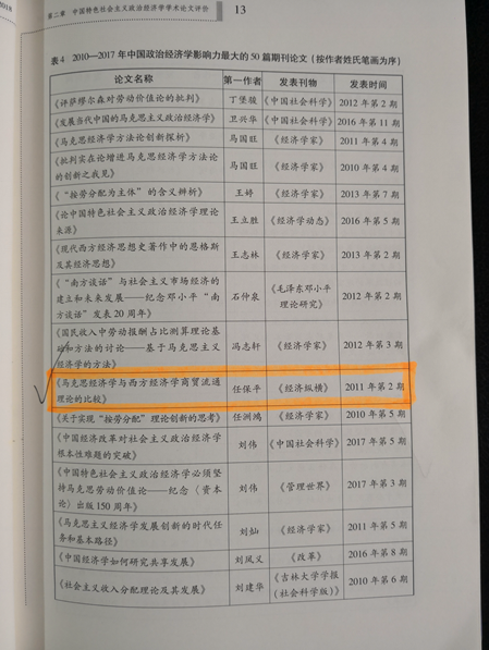该报告根据中国知网提供的期刊复合影响因子数据,结合文献被引用次数、下载次数等指标以及科学指标权重,计算“中国特色社会主义政治经济学”学术论文影响力。我院任保平教授发表于《经济纵横》2011年第2期的学术论文“马克思主义经济学与西方经济学商贸流通理论的比较”,入选2010-2017年“中国特色社会主义政治经济学”影响力最大的50篇期刊论文。
