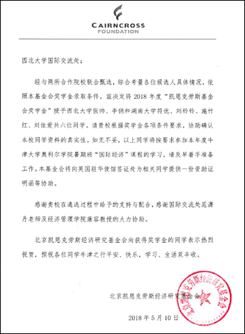 5月10日,北京凯恩克劳斯经济研究基金会发布录取通知,授予我院2017级西方经济学专业硕士研究生李俏和2016级财政学本科生张帅“凯恩克劳斯基金会奖学金”,他们将参加本年度牛津大学奥利尔学院暑期班“国际经济”课程的学习。