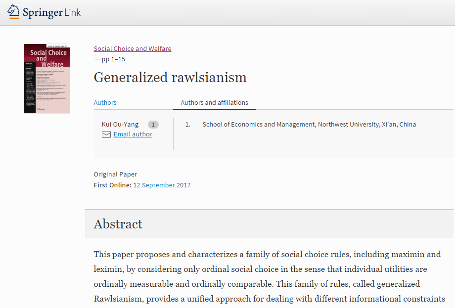 我院数理经济与统计学系欧阳葵副教授的独著论文《Generalized Rawlsianism》在国际知名SSCI期刊《Social Choice and Welfare》发表:Ou-Yang, K., “Generalized Rawlsianism,” Social Choice and Welfare (2017),https://doi.org/10.1007/s00355-017-1083-3。论文内容链接:http://rdcu.be/vNtK。该期刊是国际社会选择与社会福利学会(The Society for Social Choice and Welfare)的官方期刊,是社会选择理论与福利经济学领域的国际权威期刊。