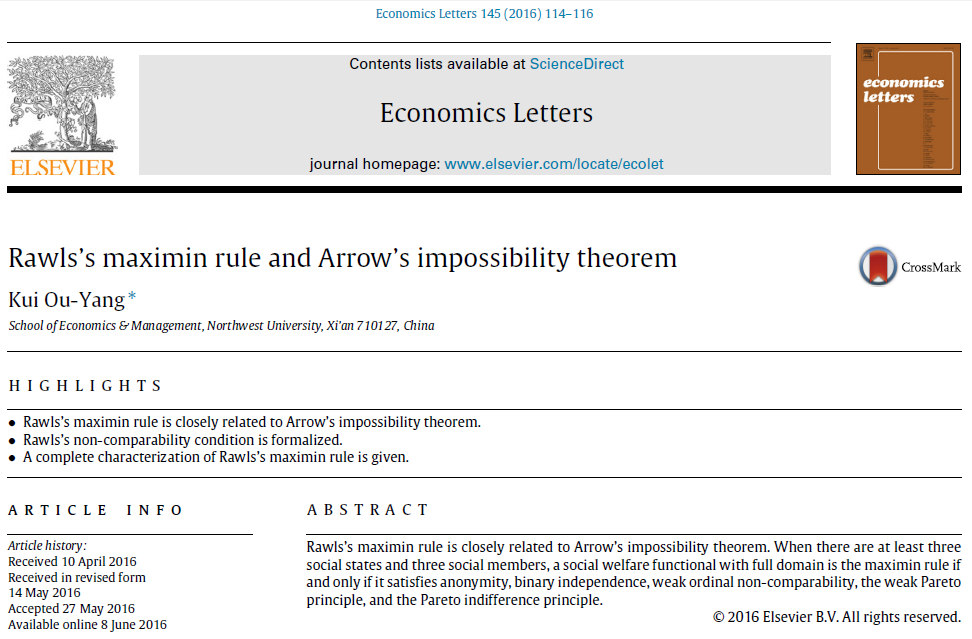 近日,我院数理经济与统计学系欧阳葵副教授的独著论文《Rawls’s Maximin Rule and Arrow’s Impossibility Theorem》在国际知名SSCI期刊《Economics Letters》发表(Kui Ou-Yang, 2016.“Rawls’s Maximin Rule and Arrow’s Impossibility Theorem”, Economics Letters 145 (8): 114-116.全文网址:http://dx.doi.org/10.1016/j.econlet.2016.09.033)。