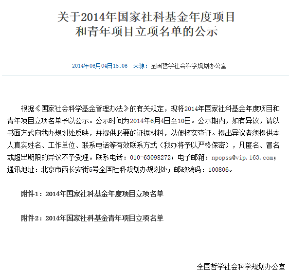 6月4日,全国哲学社会科学规划办公室对2014年国家社科基金年度项目、青年项目和西部项目进行了公示。根据评审结果,我院有5位教师的项目项获准立项,其中,重点项目1项,一般项目2项,青年项目1项,西部项目1项。