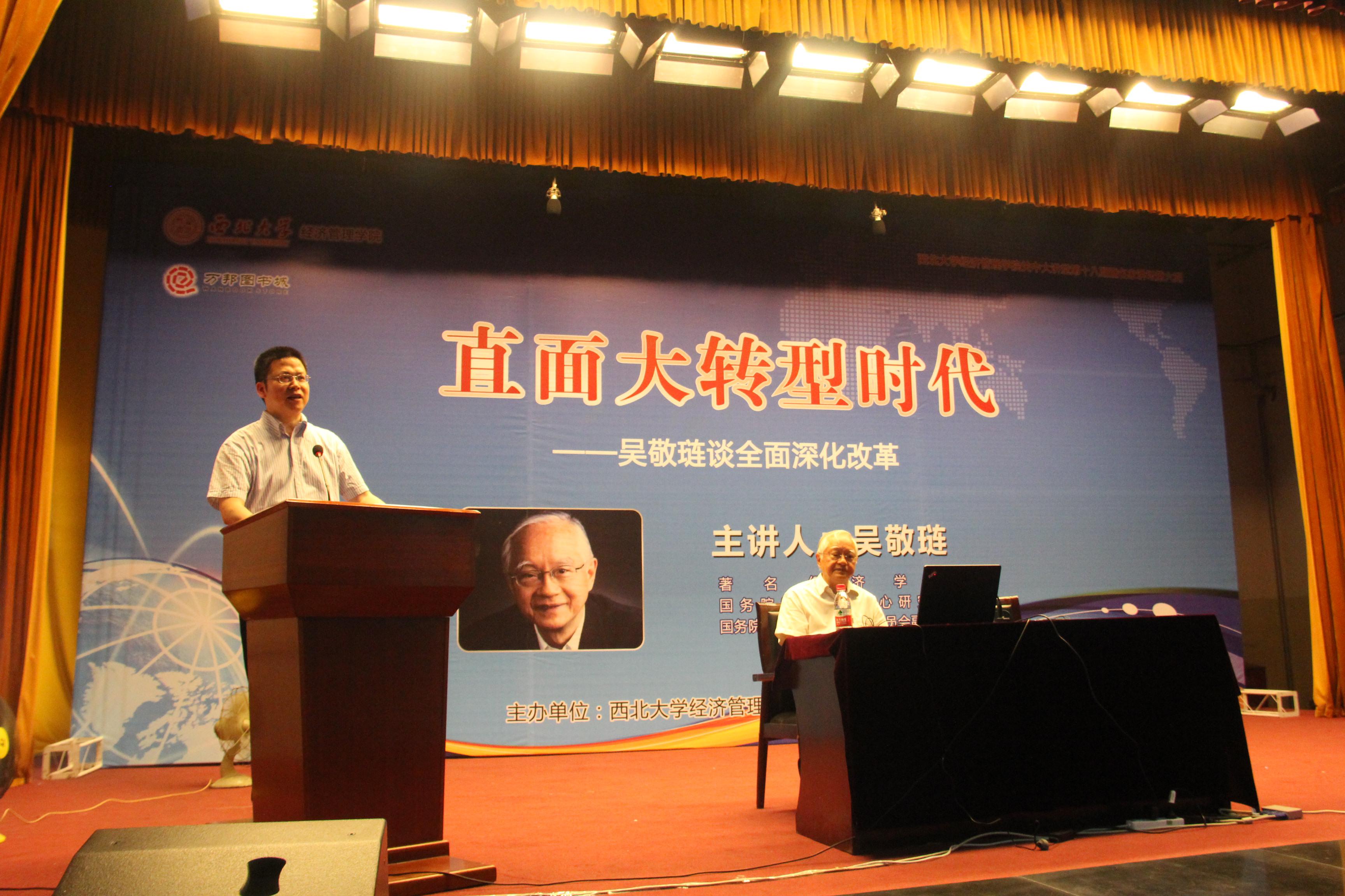 6月22日,我校侯外庐学术讲座第37讲暨经管院关中大讲堂第18讲在太白校区大礼堂成功举行,著名经济学家、国务院发展研究中心研究员吴敬琏教授应邀为我校师生做了题为《直面大转型时代——吴敬琏谈全面深化改革》的学术讲座,讲座由经管学院院长任保平教授主持。