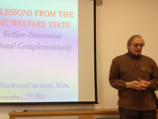 2013年11月27日下午,经管学院高端专家短期教学系列讲座在长安校区8202教室举行。法国经济学调节学派代表人物Robert Boyer教授做了题为“来自北欧福利国家的经验教训”(Some lessons from the Nordic welfare states)的学术报告。我院经济学博士、硕士及部分教师聆听了报告。报告会由院长助理师博副教授主持。