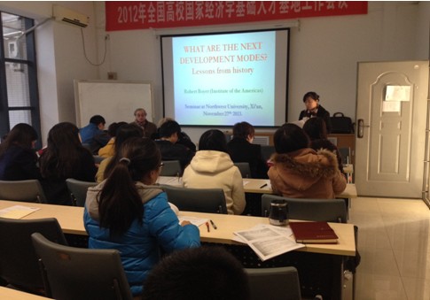 2013年11月27日上午,经管学院邀请国际高端专家短期教学系列讲座在长安校区8202教室举行。法国经济学调节学派代表人物Robert Boyer教授做了题为“增长是否带来繁荣?”(Does growth bring prosperity?)和“未来的发展模式是什么?”(What could be the next development models?)的学术报告。我院经济学博士、硕士及部分教师聆听了报告。报告会由经济学系系主任何爱萍教授主持。