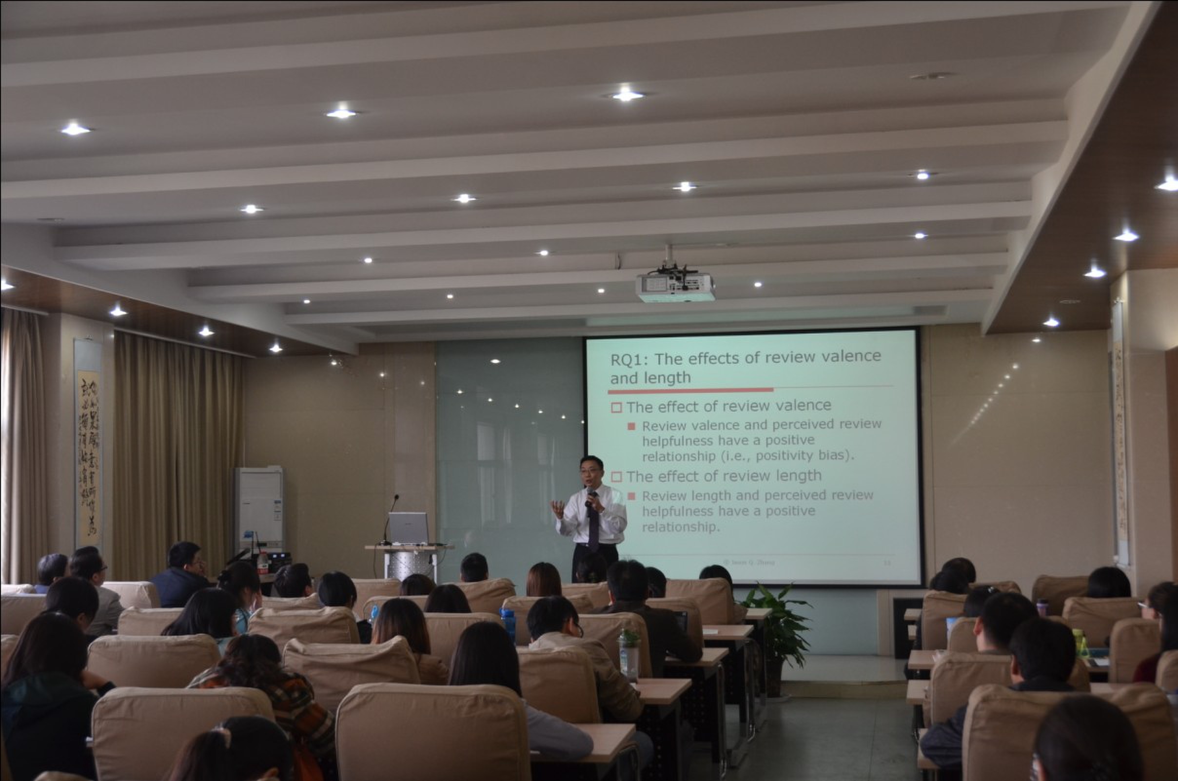 随后,章教授以其论文《消费者评论有用性的实证研究》为例,从论文的选题、破题、数据搜寻处理、分析过程等方面与大家进行了论文写作的交流。章教授提出要从一些文献漏洞入手着重研究,并以人们在Holiday Season购物为例巧妙地切入主题——消费者评论。并以单条评论的有用性作为被解释变量,以评论本身的特性、产品类型、评论者自身特性作为解释变量,利用的亚马逊的数据,采用抽样调查研究,建立了一个混合效用的二元模型,从而得出三个结论:1)特定评论有效性有正向偏差;2)功能性产品效用高于体验性产品效用;3)评论者创新性对评论的影响呈倒U型。