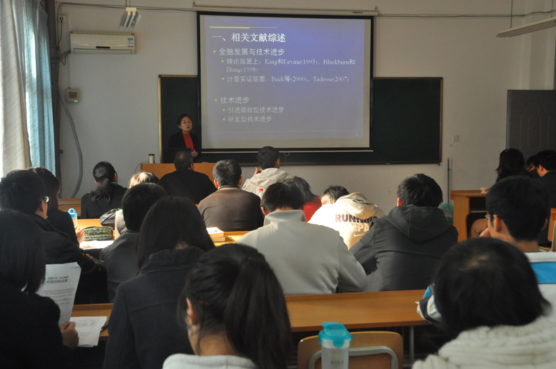 由经济学系主办的“现代经济学理论与方法创新论坛”第八卷第六期11月23日下午2点在学院8213教室举行。此次论坛由经济学系郭俊华副教授主持,刘瑞明博士评论。经济学系王聪老师担任主讲,题目为《“创造性毁灭”视角金融发展、技术吸收与研发——来自1985-2009年跨国面板数据的证据》。学院2010级金融学班的本科生和部分博、硕士生80多人参加了此次论坛。
