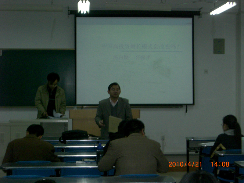 由学院经济学系主办的“现代经济学理论与方法创新论坛”第六卷第十期4月21日下午2点在学校南校区1205教室举行。此次论坛由学院经济学系高煜副教授主持,2008级西方经济学硕士魏婕做评论人,由学院2008级西方经济学博士汤向俊做了题为“中国高投资增长模式会改变吗?”的报告。学院2008级经济学基地班、数理经济学班专业的学生60多人参加了此次论坛。
