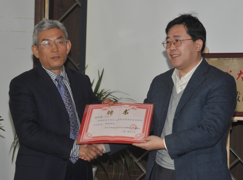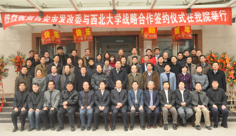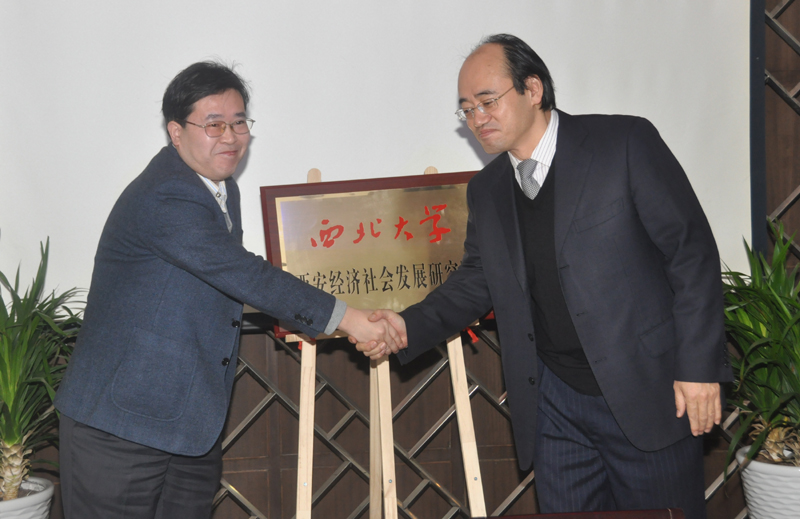 西安市发改委与西北大学首先签订了战略合作伙伴关系书,双方将在西安经济社会发展问题研究、人员培训和交流等各方面展开全方位的合作,这标志着西安市政府和西北大学在政-校合作方面的又一新进展。按照战略合作达成的意向,西安市发改委与西北大学共同发起成立西北大学西安经济社会发展研究院,由西北大学副校长任宗哲教授任理事长,西安市发展和改革委员会副主任惠应吉教授、776net必赢官网院长白永秀教授任副理事长,王学东主任和任宗哲校长共同为为研究院成立揭牌。按照研究院章程,理事会聘请白永秀教授为院长,负责研究院日常运营;同时研究院院长聘请孟春、曹刚等省内外长期从事区域经济研究,尤其是长期从事陕西和西安经济社会问题研究的专家学者、知名企业家60余位研究员。研究院的成立将为更好的研究西安问题,推进西安发展打造更好、更高的平台。