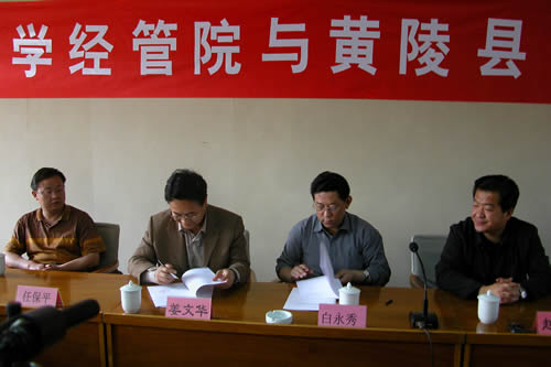 院长白永秀教授、院长助理惠宁教授、经济学系主任任保平教授、黄陵县县委书记赵辉远、县委副书记白桉定、副县长蒋文华以及学院的研究机构和黄陵县各部门负责人出席了签字仪式。双方在项目委托、业务咨询、人才培养、人员交流、建立实习基地等多方面达成了战略合作意向。黄陵县委副书记白桉定主持了签字仪式,院长白永秀教授和黄陵县常务副县长姜文华先生代表双方签字,院长白永秀教授和黄陵县县委书记赵辉远先生分别代表合作双方发表了热情洋溢的讲话,学院和黄陵县人民政府基于合作双赢、相互信任的理念进行战略合作。通过战略合作,利用我院的学科优势、人才优势和黄陵县的地缘和资源优势,实现优势互补,携手发展。通过战略合作,在加快黄陵县县域经济社会发展的同时,为学院的研究提供与实践相结合的平台,为学生实习提供基地。在签字仪式上,除了签订战略合作意向外,还正式签订了《黄陵县“十一五”发展纲要及2020年展望》的协议,拉开了双方合作的序幕。