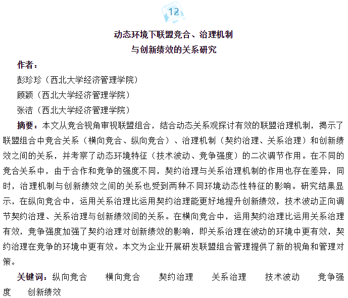 近日,经管院2016级博士研究生彭珍珍、顾颖教授与张洁副教授(通讯作者)在国内顶级期刊《管理世界》2020年第3期上发表了题为《动态环境下联盟竞合、治理机制与创新绩效的关系研究》的学术论文。