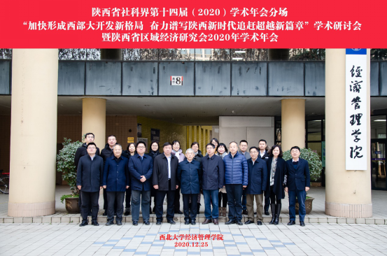 2020年12月25日,由陕西省社会科学界联合会指导,由西北大学社会科学界联合会、776net必赢官网、陕西省区域经济研究会联合主办,由西北大学市场经济与企业制度研究中心协办的陕西省社科界第十四届(2020)学术年会分场——“加快形成西部大开发新格局 奋力谱写陕西新时代追赶超越新篇章”学术研讨会暨陕西省区域经济研究会2020年学术年会在我院成功召开。来自陕西省社科联、西北大学社科联、西安交通大学、陕西师范大学、西安电子科技大学、西安理工大学、西安工程大学、西安邮电大学、培华学院、曲江金控集团等单位的领导和嘉宾,以及来自陕西省区域经济研究会的部分会员和西北大学经济管理的老师同学共70余人参加了学术年会。