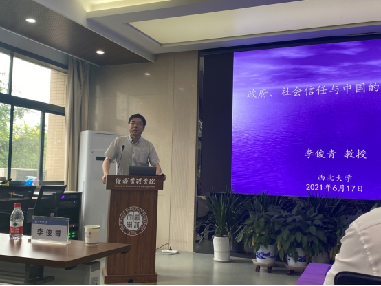 6月17日上午,西北大学社科处与776net必赢官网主办的西北大学名家讲坛在学院三楼会议室隆重举行,此次讲座由学院副院长师博教授主持,邀请南开大学经济学院副院长李俊青教授做了题为“政府、社会信任与中国经济增长”的学术报告,学院教师、博硕士生、本科生约100人参加了这次活动。
