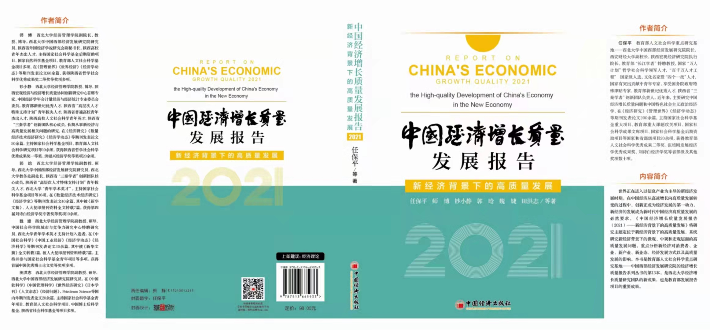近日,由教育部人文社会科学重点研究基地—西北大学中国西部经济发展研究院院长任保平教授及其团队成员师博教授、钞小静副教授、郭晗副教授、魏婕副教授、田洪志副教授等集体撰写的年度标志性成果——《中国经济增长质量报告(2021)》在中国经济出版社出版。全书由21章内容构成,共37.3万字。本书是研究院科研团队集体智慧的结晶,是新经济背景下对高质量发展研究的一次理论探索。