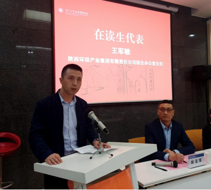 典礼在庄严的国歌声中拉开帷幕。资深媒体人崔静雅同学代表新生上台发言。她表示十分珍惜这一次宝贵的校园生活,希望与同学们一起成长,共达理想。陕西环保产业集团有限责任公司综合办公室王军敏主任作为在校生代表上台发言。从精英发展项目考入西北大学MBA,他以自己亲身经历告诉各位新同学们:认真把握好在校时间,不要缺席任何一个课堂,积极参与每一次活动,珍惜身边每一位伙伴。