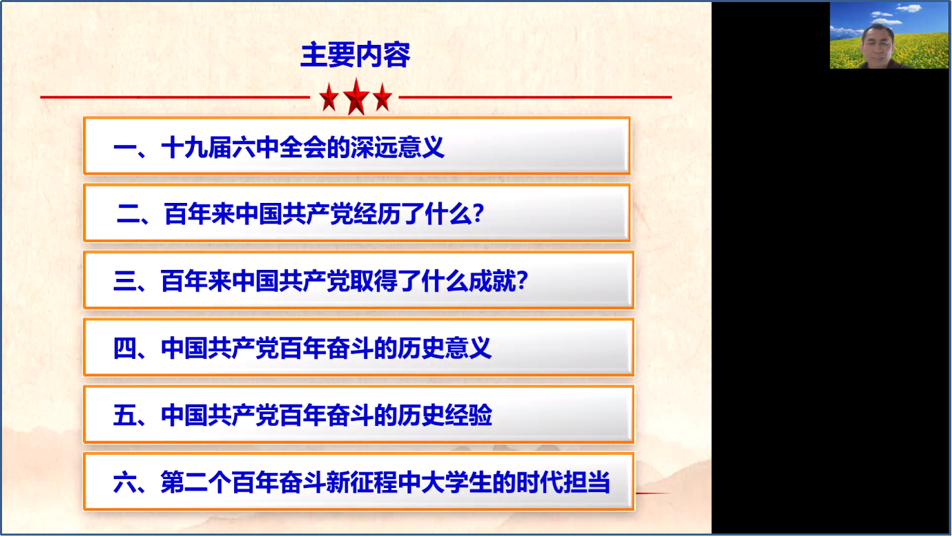 为进一步推进三全育人工作,形成思想政治教育的生动局面,3月19日,财政与税收系党支部书记李伟通过腾讯会议为财政与税收系本科生做了题目为《传承奋斗精神,开创百年新业》的专题讲座,系统学习了十九届六中全会精神,受到了学生的欢迎。