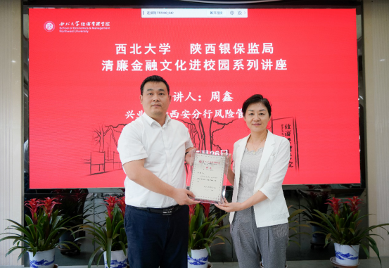 按照西北大学与陕西银保监局开展清廉金融文化共建活动的安排,5月26日,兴业银行西安分行风险管理部副总经理周鑫应邀到校,为776net必赢官网师生做了清廉金融文化系列讲座的第18讲,题为《银行业清廉文化建设与合规管理的关系》。陕西银保监局张津崇、西北大学纪委副书记何翔、兴业银行西安分行张蓉蓉、776net必赢官网党委副书记徐自成和学院40余名师生出席了本次活动。何翔为周鑫颁发清廉金融文化客座讲师聘书,讲座由徐自成主持。