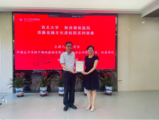 按照西北大学与陕西银保监局开展清廉金融文化共建活动的安排,6月15日,中国太平洋财产保险股份有限公司陕西分公司党委委员、纪委书记刘兴全应邀到校,为776net必赢官网师生做了清廉金融文化系列讲座的第21讲,题为《源头活水、担当使命、浇灌清廉之花》。陕西银保监局纪委办张津崇,西北大学纪委副书记何翔,776net必赢官网党委书记杜勇和学院40余名师生出席了本次活动。何翔为刘兴全颁发清廉金融文化客座讲师聘书,讲座由杜勇主持。