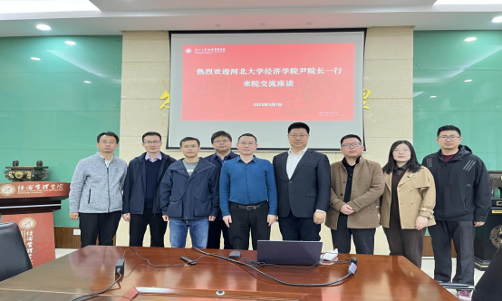 3月7日下午,河北大学经济学院副院长尹成远教授、国际经济与贸易系主任张晓华教授、经济统计学系主任户艳岭副教授和刘超副教授4位老师来我院调研座谈。学院副院长李辉、数理经济与统计学系南士敬副教授和翁宇雷副教授、世界经济与贸易系主任王颂吉副教授、史贝贝副教授及博士生参加了座谈会。座谈会由李辉副院长主持。
