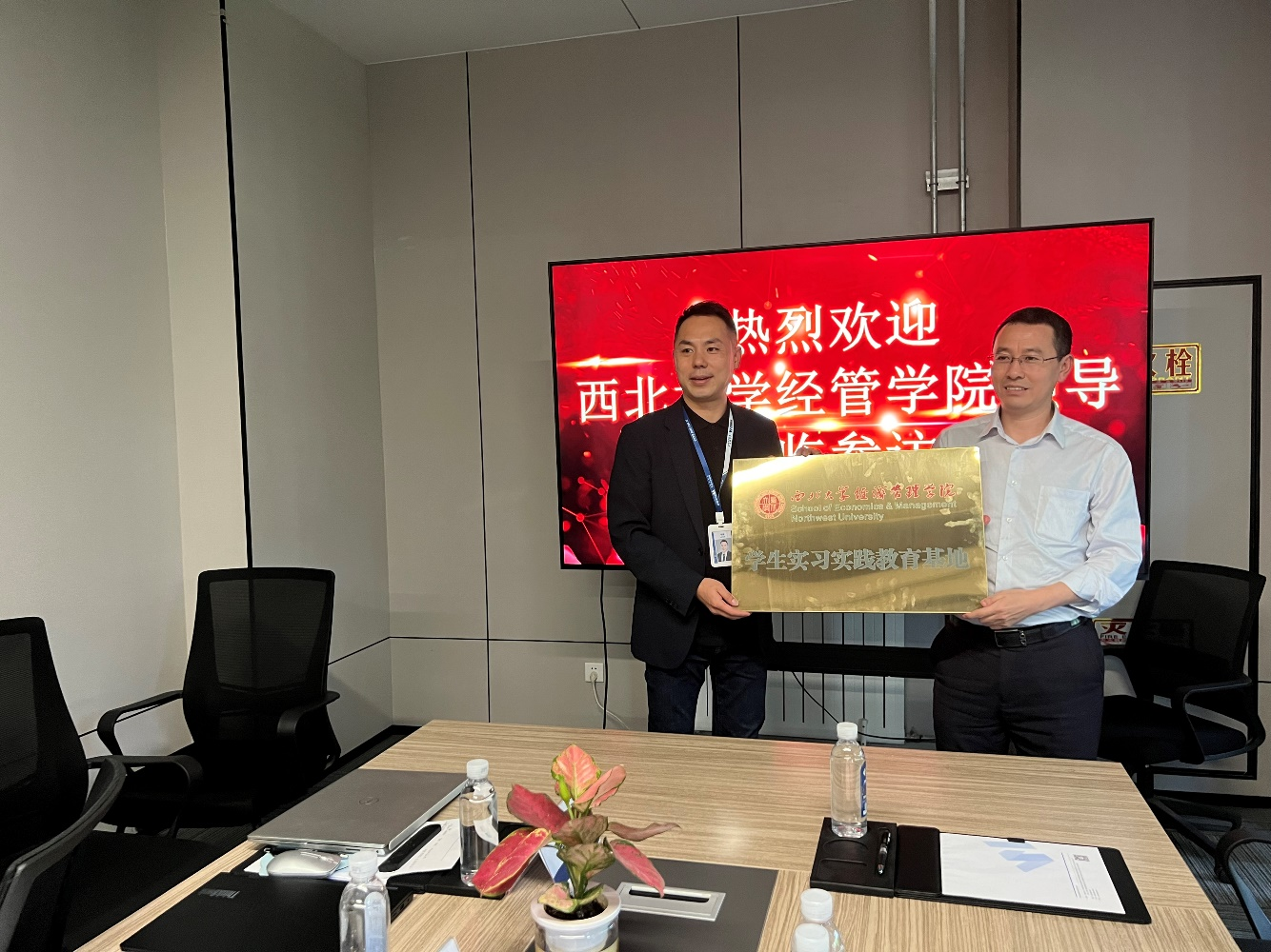 在座谈会上,四维数邦生态发展中心总经理李严向信管专业的师生介绍了四维数邦的企业愿景、发展战略、核心竞争力和商业模式,同时还介绍了四维数邦在人才引进和培养方面的政策和机制,欢迎信管专业的优秀学生加入四维数邦。我院李辉副院长对四维数邦表示感谢和赞赏,认为四维数邦是时空大数据行业的佼佼者,时空大数据管理是信息系统领域的一个重要分支,具有广泛的应用前景和社会价值,信管专业与四维数邦有着紧密的联系和契合度,希望通过此次基地建设,加强双方的交流和合作,为信管专业的教学和人才培养提供更多的资源和机会。李辉副院长和李严总经理共同为西北大学经管学院学生实习实践教育基地揭牌。