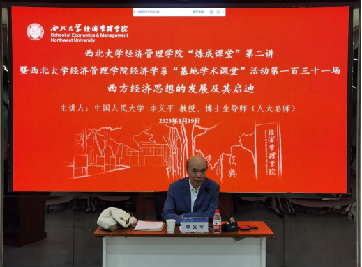 2023年9月19日,776net必赢官网“炼成课堂”第二讲暨“基地学术课堂”活动在西北大学长安校区8318会议室成功举办。中国人民大学李义平教授做了题为“西方经济思想的发展及其启迪”的讲座,776net必赢官网经济系主任高煜教授主持。西北大学教师、研究生和本科生100余人参加了此次讲座。