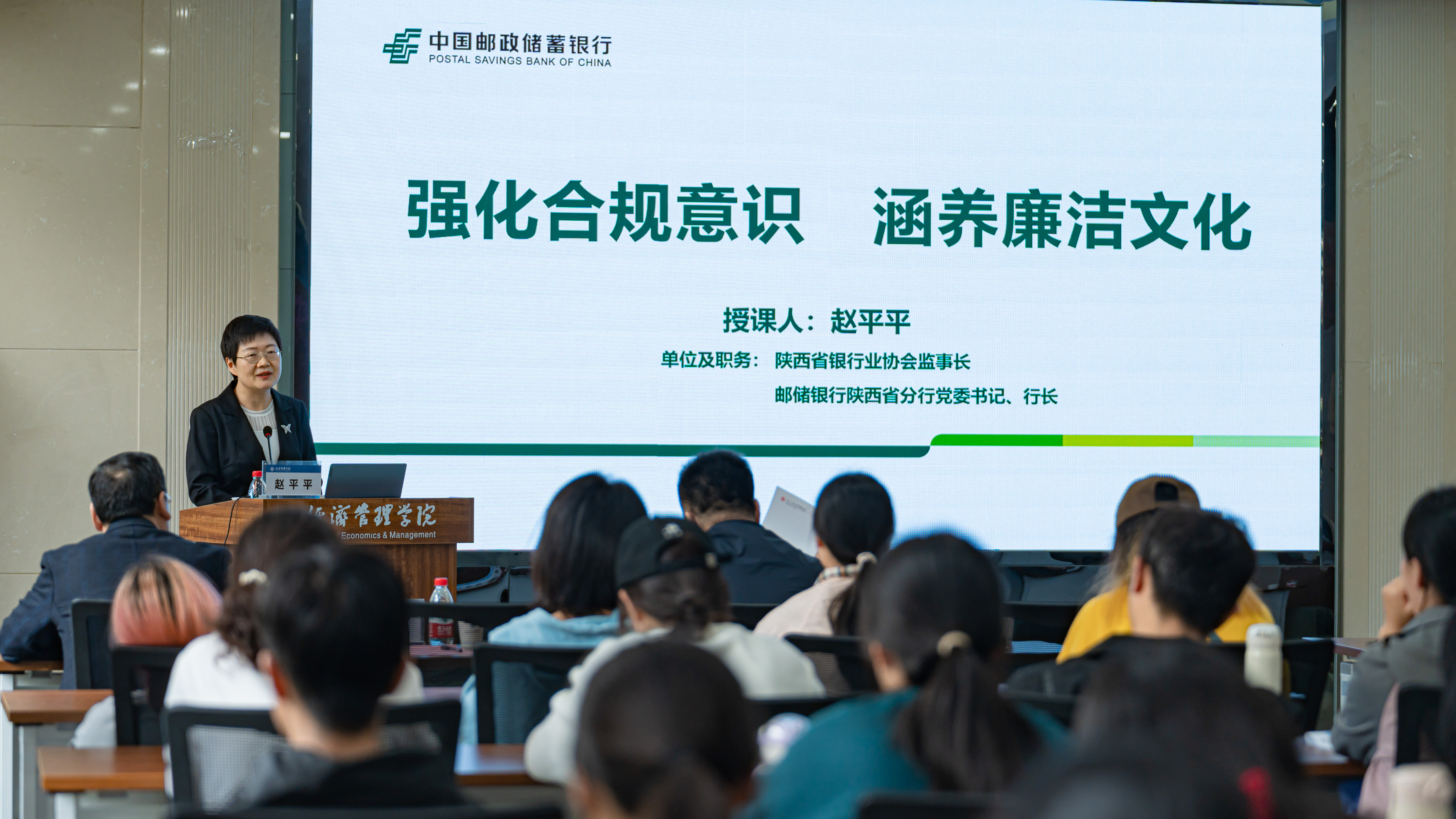 10月11日,陕西省银行业协会监事长、中国邮政储蓄银行陕西省分行党委书记、行长赵平平应为我校776net必赢官网师生作了题为《强化合规意识,涵养清廉文化》的清廉金融文化专题讲座。国家金融监督管理总局陕西监管局纪委书记蒋怡,中国邮政储蓄银行陕西省分行纪委书记文晓东,我校党委副书记、纪委书记、省监委驻校监察专员肖道远和学校相关单位负责人出席活动,776net必赢官网师生100余人聆听讲座,776net必赢官网党委主要负责人主持讲座。