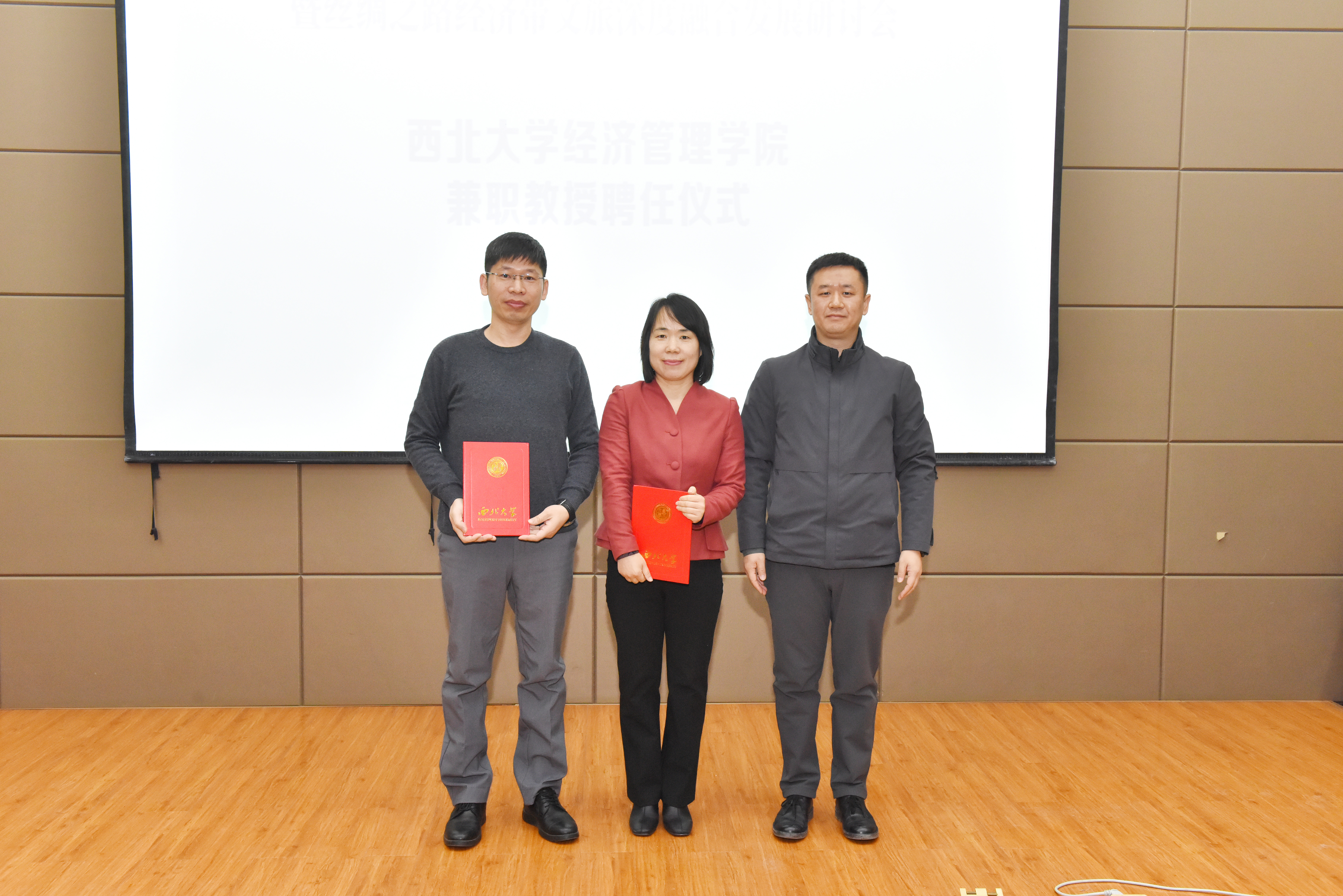 开幕式第二项为兼职教授聘任仪式。由776net必赢官网党委书记杜勇宣读聘任人员简介,由西北大学人力资源部副部长张浩为宋瑞、厉新建、秦宇三位专家颁发西北大学兼职教授聘书。