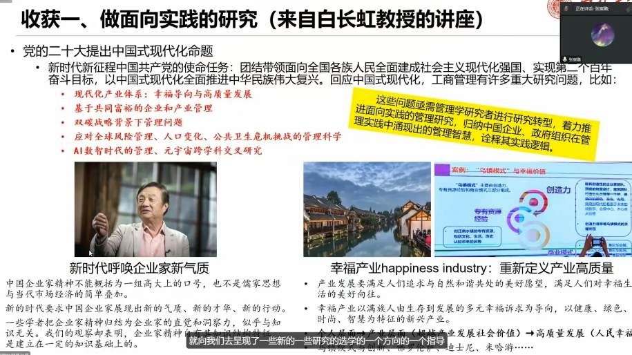 单宇副教授从管理理论与实践的脱轨问题和企业实践与教学科研的融合探索出发,在自身研究成果的基础上,分享了关于案例研究的起点与切入点选择、企业调研的深度与广度策略、案例研究的数据来源、访谈技巧与信息收集以及复盘方法;以调研—洞察—洞见为逻辑线,将经验技巧与个人研究相结合,并分享了《管理世界》论文写作与投稿经验、研究逻辑在研究中的应用与洞见、企业实践经验分享与研究方法、访谈技巧与挖掘企业价值点等。