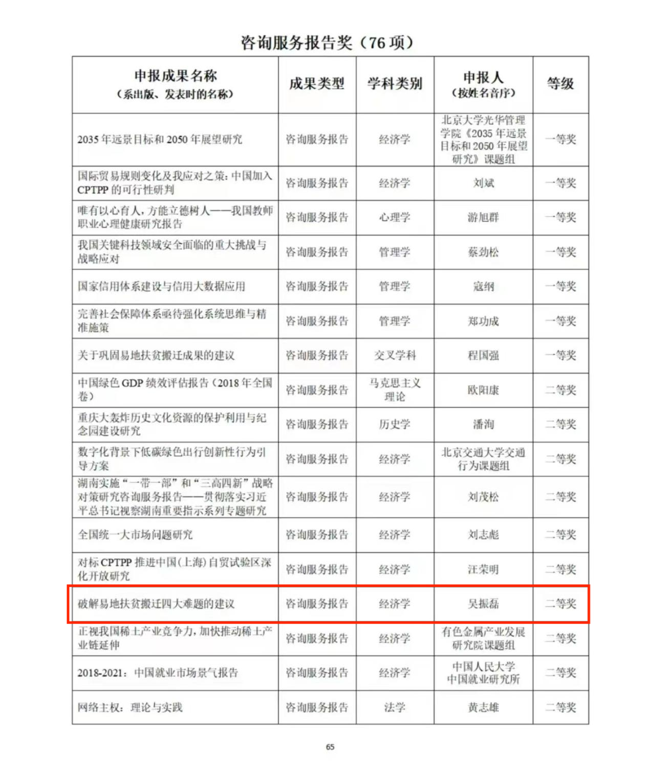 近日,教育部公示了第九届高等学校科学研究优秀成果奖(人文社会科学)获奖名单,我院教授吴振磊副校长的研究成果《破解易地扶贫搬迁四大难题的建议》获教育部第九届高等学校科学研究优秀成果奖二等奖(咨询服务报告奖)。