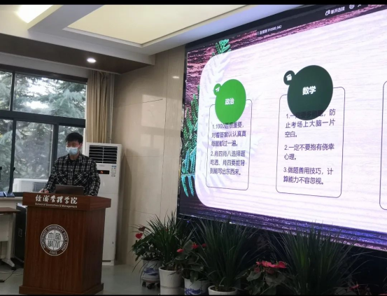 在管理大类交流分享会上,郭昊同学和包瑞婧同学从考研试题、备考复习、备战心态三个角度进行了经验分享。在试题方面,从历年真题的时间、题型、分值与知识点等进行详细讲解;在备考复习方面,希望考生能够合理安排时间,反复且有计划的复习,对于重、难点进行突破;在心态方面,三位同学就自身经历勉励备战考生找到适合自己的节奏,及时调整心态,适当放松。