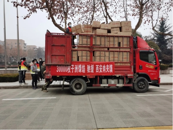 776net必赢官网联系的西安云蛋电子商务有限公司、子洲县双湖食品有限责任公司、子洲县老炉坊食品有限公司、子洲县三秦缘物流有限公司、陕西梦诏文化传媒有限公司、西安至开电子科技有限公司、陕西黄土峁峁农业开发有限公司等7家企业联合捐赠子洲馃馅30000个和100盒杂粮。