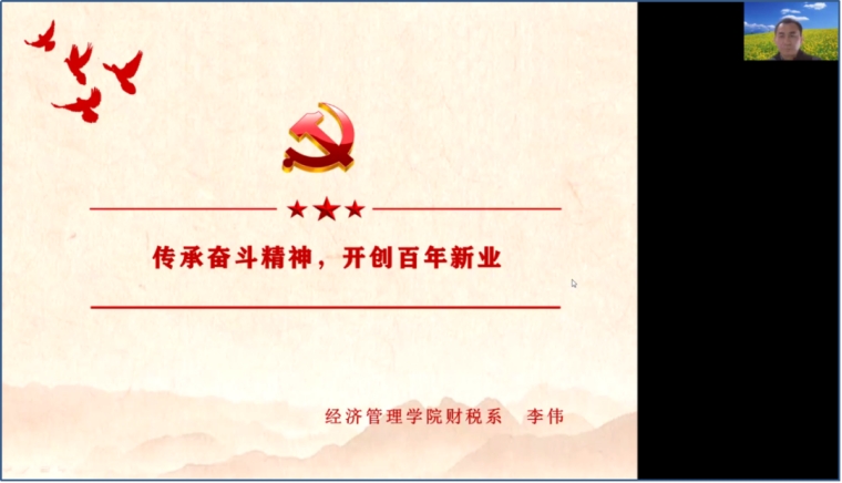 为进一步推进三全育人工作,形成思想政治教育的生动局面,3月19日,财政与税收系党支部书记李伟通过腾讯会议为财政与税收系本科生做了题目为《传承奋斗精神,开创百年新业》的专题讲座,系统学习了十九届六中全会精神,受到了学生的欢迎。